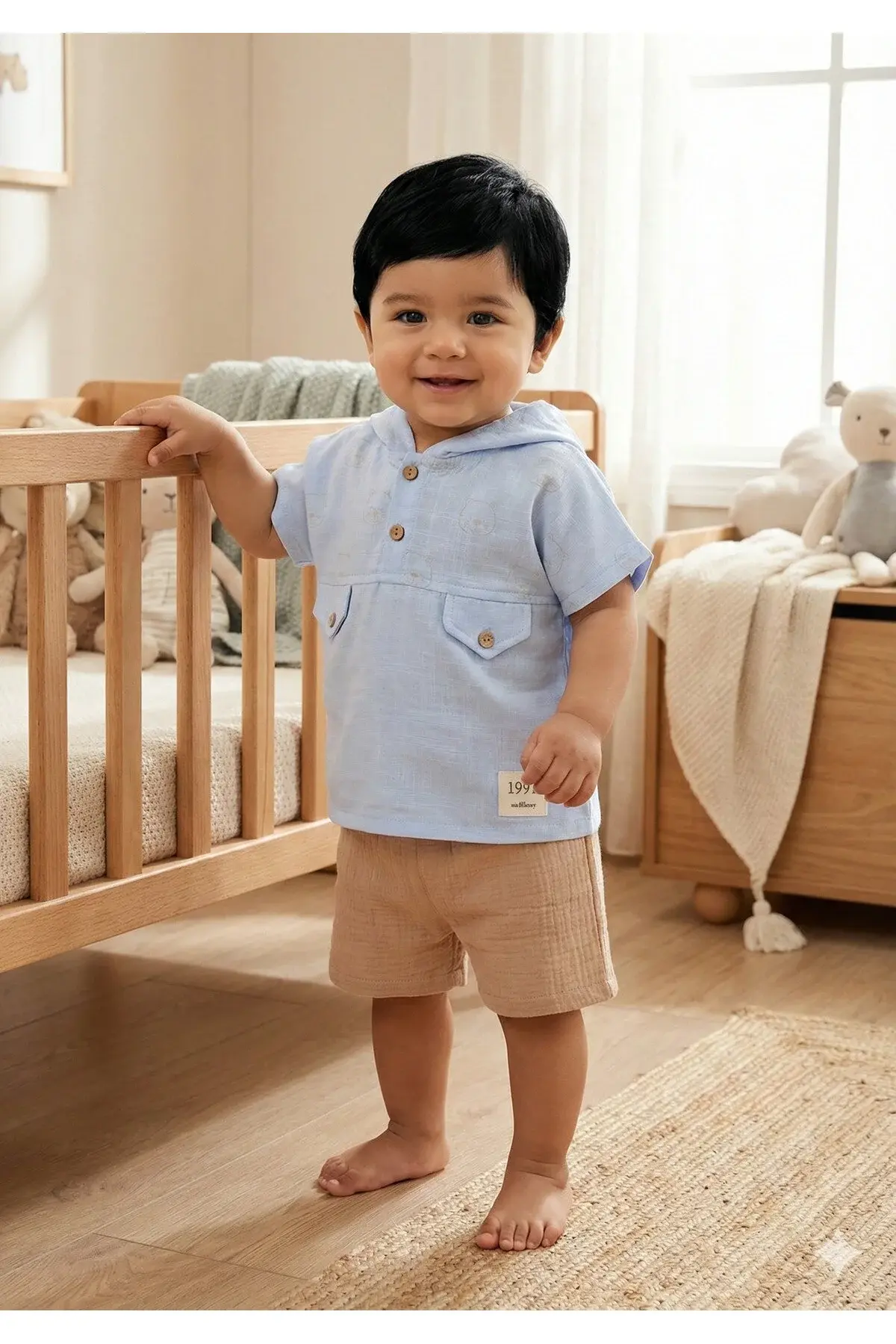 Organik Pamuklu Kapüşonlu Bebek Yazlık Mavi Şort Takımı (9-12-18 Ay) - Yumuşak Keten-Müslin Karışımı Seri - 1012-Mavi