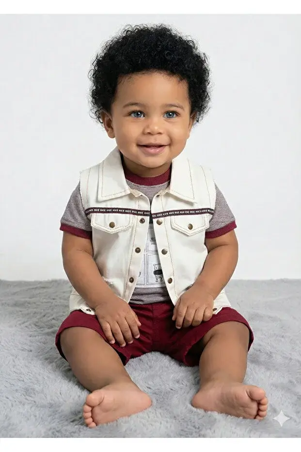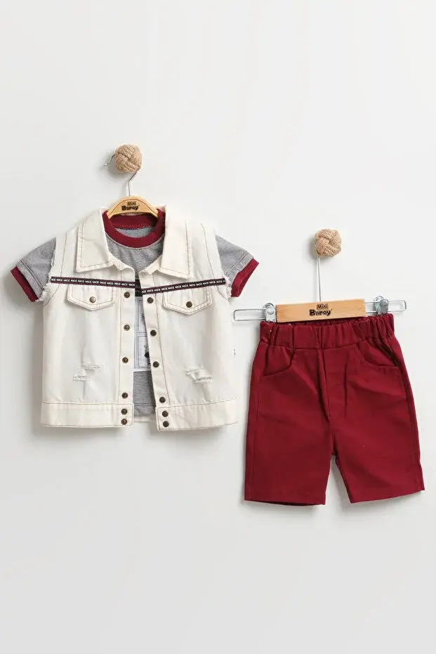 Özel Yırtık Detaylı Erkek Bebek 3'lü Yazlık Takım 9-12-18 Ay - Organik Pamuk Seri -862-Bordo