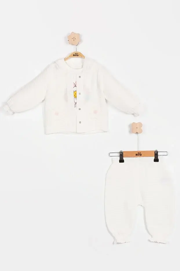 Pastel Renkli Müslin 3'lü Bebek Takımı (9-12-18 Ay) %100 Pamuklu Hırkalı Kız Bebek Seti Seri - 1013-Beyaz