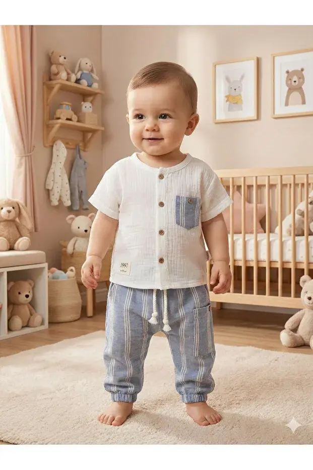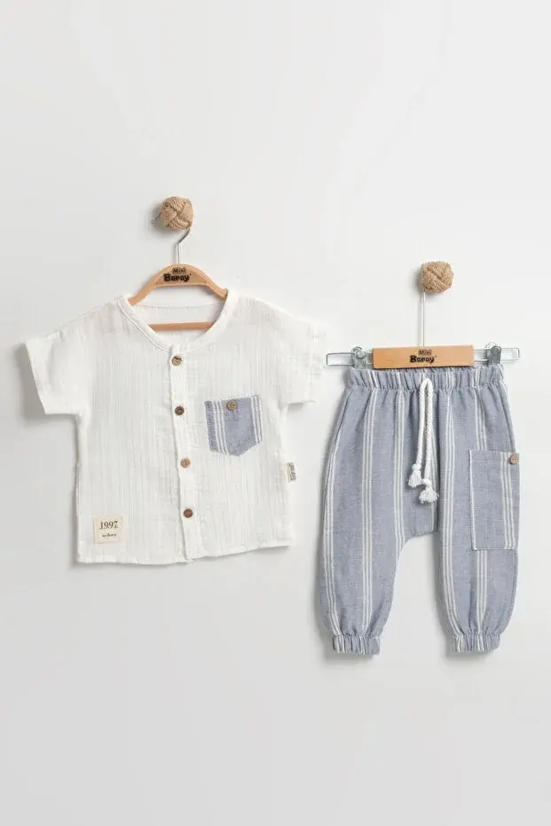 Pratik Cepli Çizgili Pantolonlu Bebek Yazlık Takım 9-12-18 Ay - Organik Müslin Kumaş Seri -988-Mavi