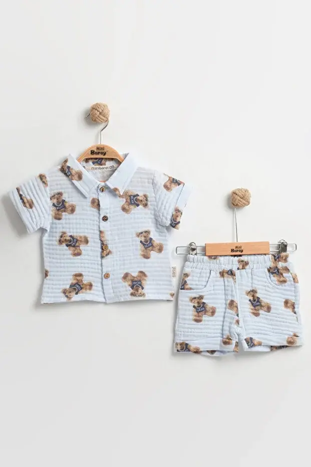 Sevimli Ayıcık Baskılı Erkek Bebek Şortlu Takım (9-12-18 Ay) - Organik Müslin Kumaş Seri - 995-Mavi