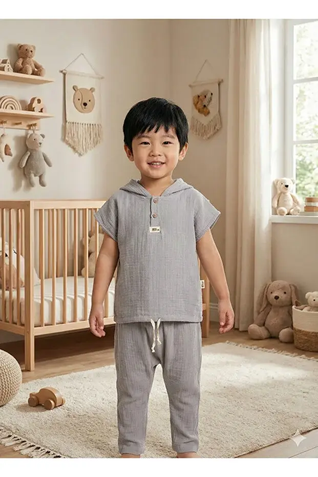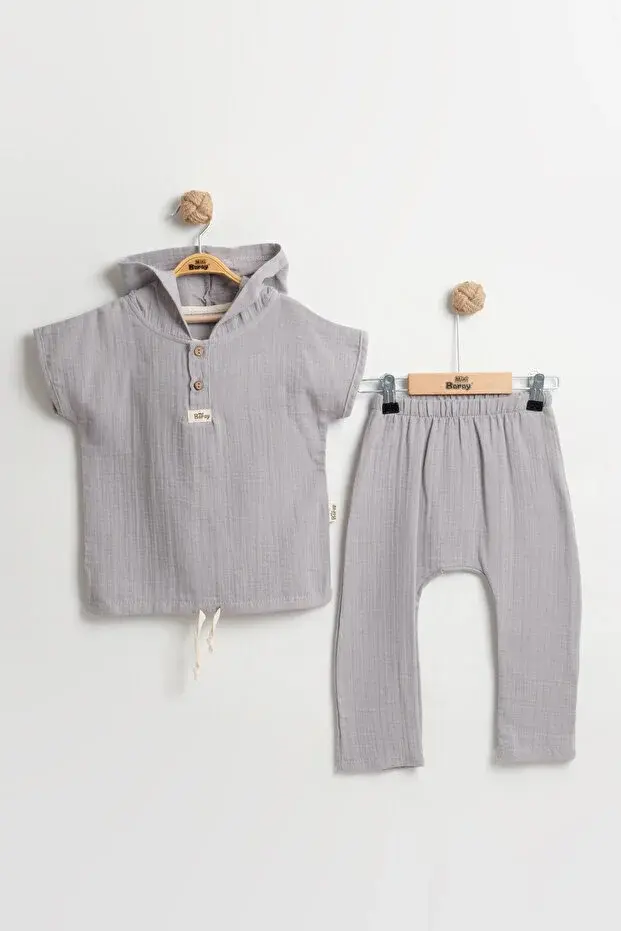 Yaş Erkek Çocuk Kapüşonlu Yazlık Müslin Takım - 2-3-4-5 yaş Nefes Alabilir Pamuklu Bebek Kıyafeti Seri -843-Gri