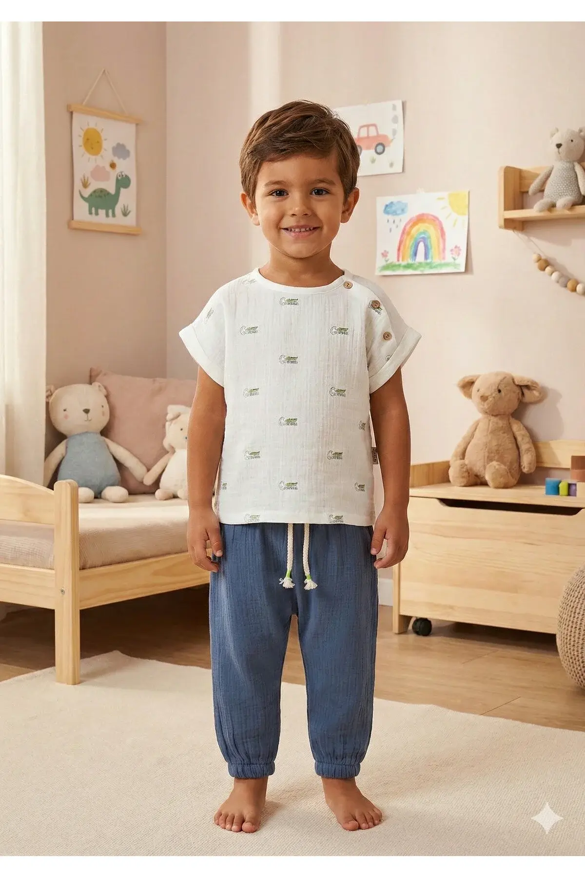 - Organik pamuklu kumaşı sayesinde çocukların cildine zarar vermeden konforlu bir kullanım sunar.