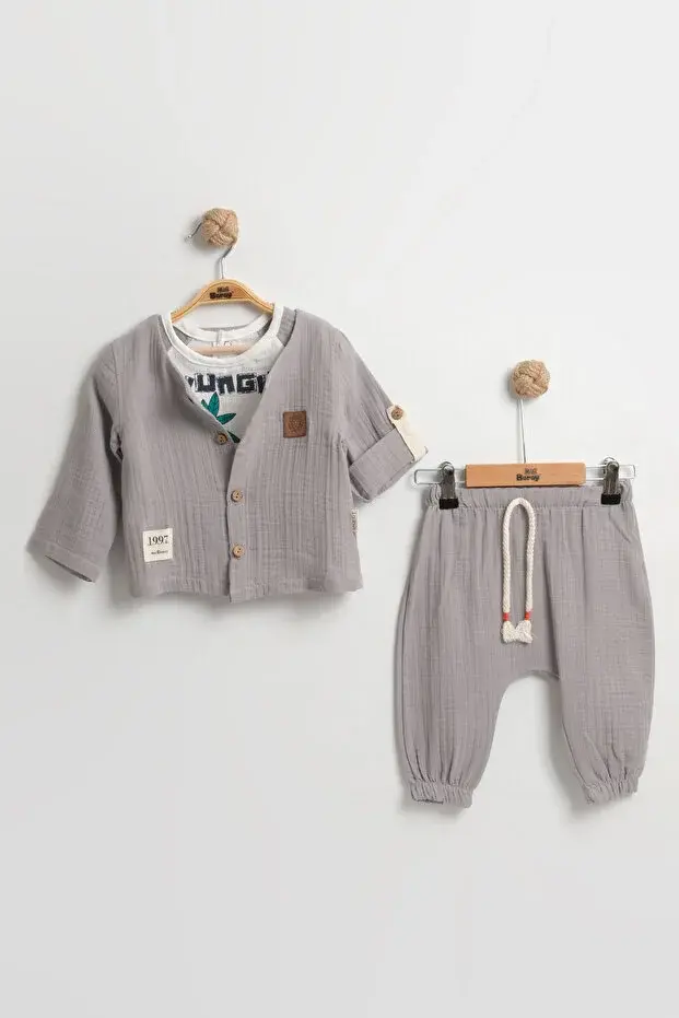 Zürafa Desenli 3'lü Erkek Bebek Takımı (9-12-18 Ay) - Uzun Kollu Gömlek+Tişört+Müslin Şort Set Seri - 989-Gri