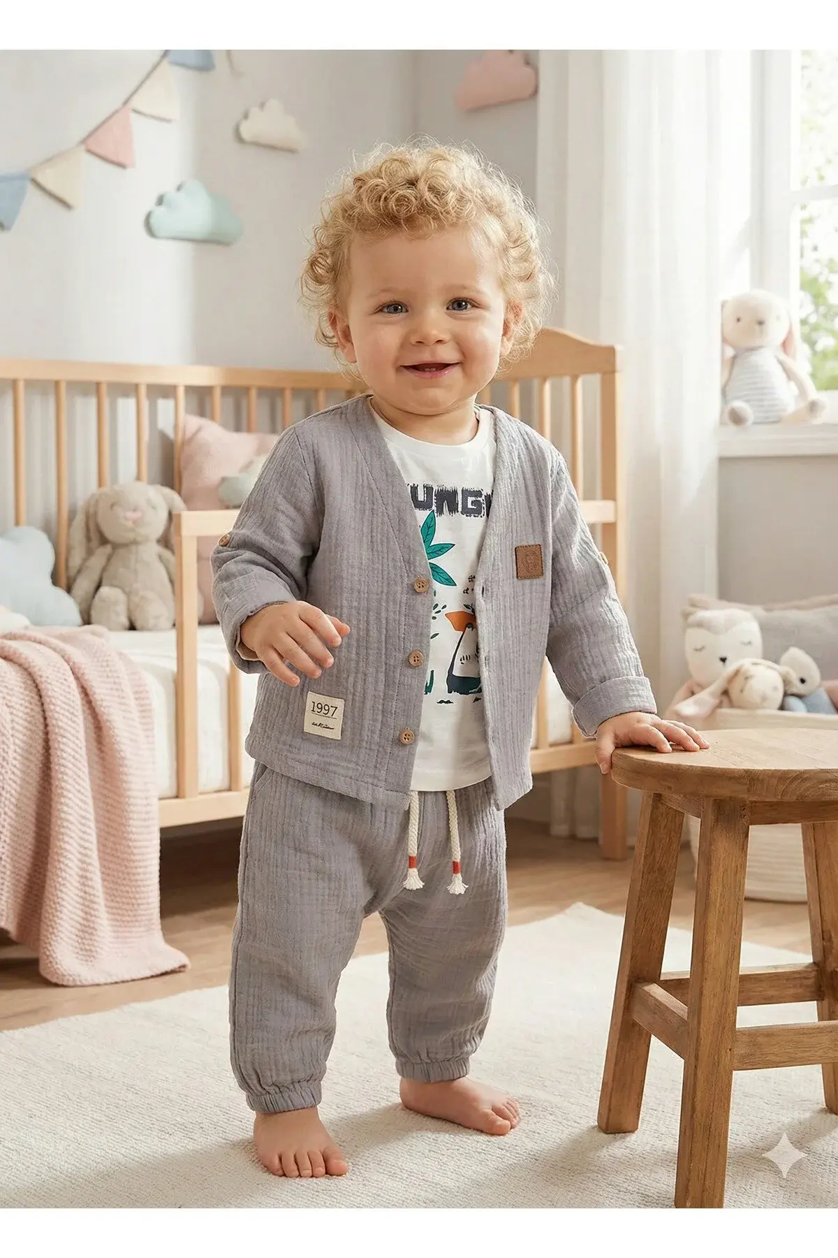 - Zürafa desenleriyle süslenmiş, bebeklerinize neşe katan 3'lü erkek bebek takımı.
